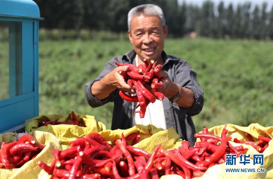 9月16日,阜城縣王集鄉(xiāng)南張莊村農(nóng)民在展示采摘的辣椒。近年來,河北省阜城縣王集鄉(xiāng)在推進(jìn)產(chǎn)業(yè)富民過程中,積極引導(dǎo)農(nóng)民調(diào)整農(nóng)業(yè)產(chǎn)業(yè)結(jié)構(gòu),按照品種特色化、種植規(guī)模化、產(chǎn)銷一體化的“公司+基地+農(nóng)戶”的經(jīng)營模式,鼓勵(lì)農(nóng)民發(fā)展特色辣椒種植,推行“訂單種植”模式,開辟出了一條農(nóng)民創(chuàng)收新路徑。目前,阜城縣王集鄉(xiāng)辣椒種植面積3100余畝,每畝年收益2500元以上,帶動(dòng)當(dāng)?shù)剞r(nóng)民實(shí)現(xiàn)增收。新華社記者朱旭東攝