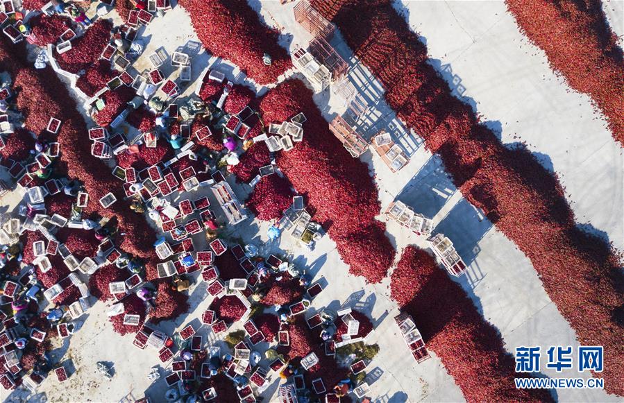 秋收時(shí)節(jié),吉林省白城市通榆縣的辣椒迎來豐收。火紅的辣椒和勞作的農(nóng)民構(gòu)成一幅幅美麗的豐收?qǐng)D景。