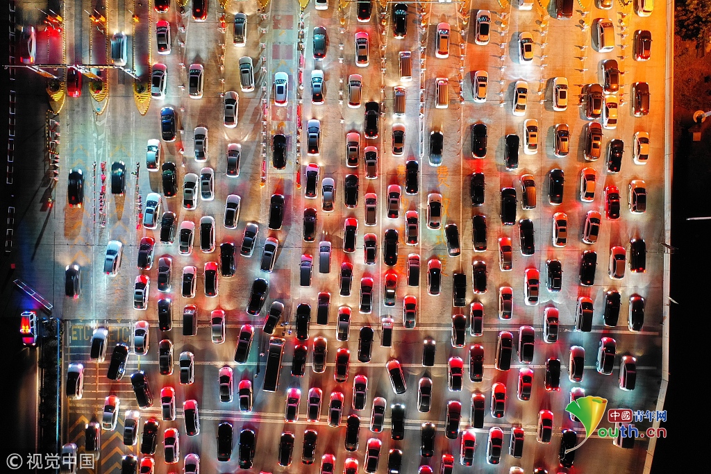 從天上鳥(niǎo)瞰,車(chē)輛的尾燈宛若一條紅色的巨龍,望不到盡頭,場(chǎng)面十分壯觀。