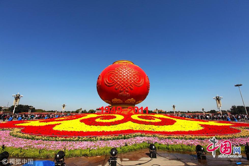 2011年天安門廣場(chǎng)中心花壇的主體部分為一只喜慶的大紅燈籠,底部襯托著由花草組成的祥云圖案,南北兩側(cè)分別立有“1949-2011”、“祝福祖國”等字符。燈籠、中國結(jié)、祥云等傳統(tǒng)元素,以及中國紅和金色等代表中國喜慶顏色的運(yùn)用,使花壇的中國傳統(tǒng)文化韻味十足?;▔w造型簡潔、主題鮮明、熱烈喜慶,表現(xiàn)了對(duì)祖國繁榮富強(qiáng)、欣欣向榮的美好祝福。