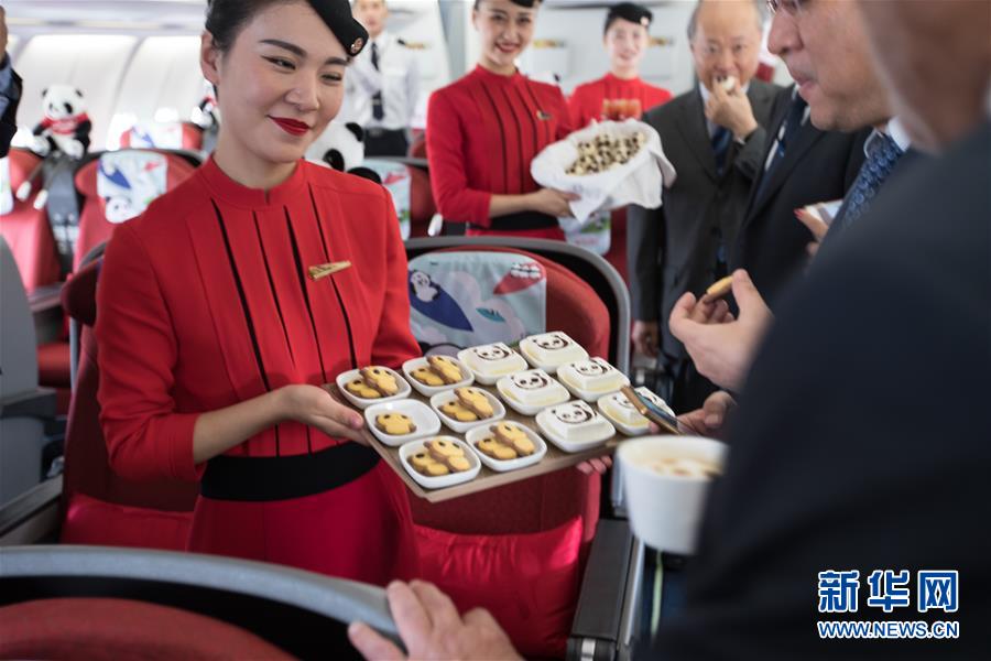 9月26日,在以色列特拉維夫本·古里安國(guó)際機(jī)場(chǎng),四川航空公司空乘人員在機(jī)上展示熊貓主題的小吃。 新華社記者郭昱攝