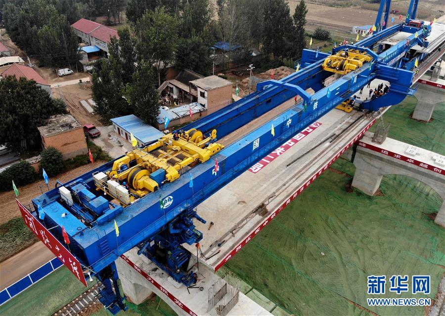 9月27日,中鐵二局的施工人員使用大型機械在鄭(州)濟(南)高速鐵路(鄭濮段)站前工程VI標施工現(xiàn)場架設(shè)40米簡支箱梁(無人機拍攝)。 新華社記者李安攝
