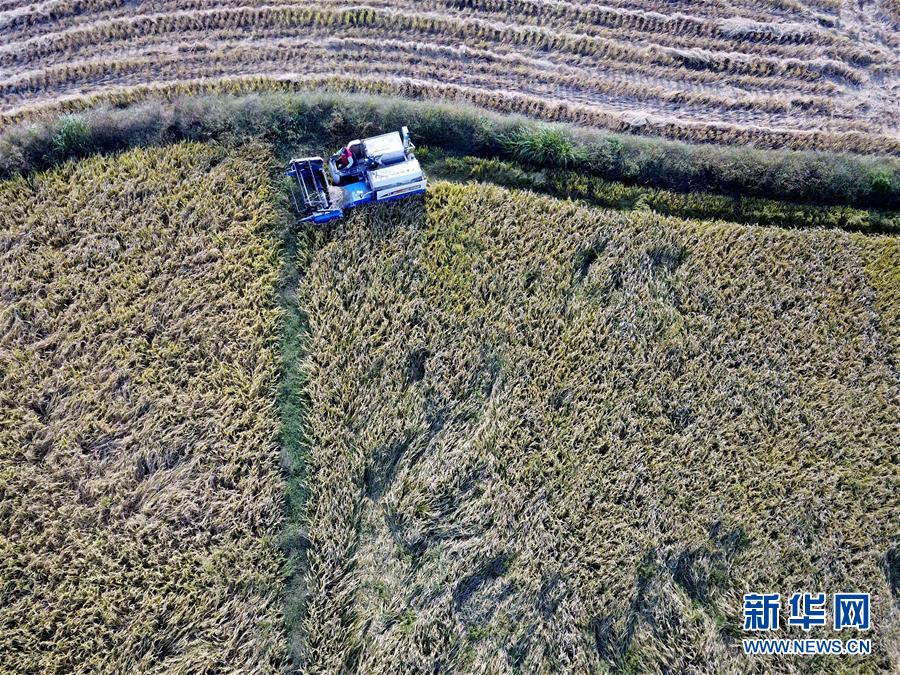 9月27日,在鳳陽縣小崗村,農(nóng)民駕駛收割機收割水稻(無人機拍攝)。新華社記者 劉軍喜 攝