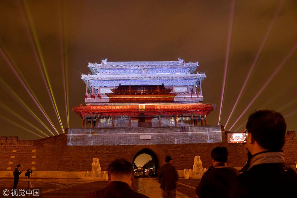 永定門城樓南廣場舉辦的“我愛你中國”迎國慶燈光秀于2018年9月28日晚正式向市民首秀。即日起至10月7日,每晚這里都將啟動燈光表演。