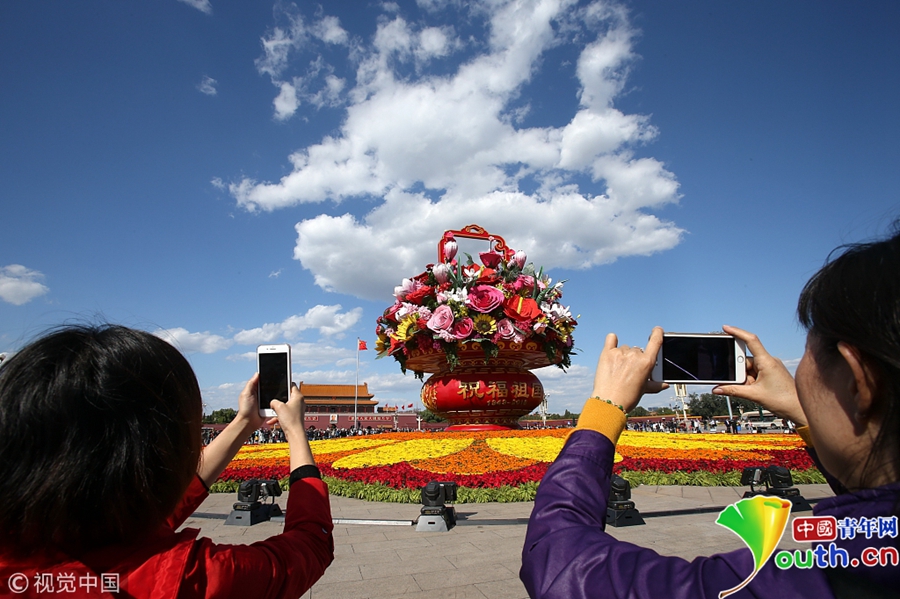 2018年9月29日,北京迎來高顏值好天氣,天安門廣場(chǎng)“祝福祖國(guó)”花壇在藍(lán)天白云映襯下壯美如畫。游客紛紛拿起手機(jī)、相機(jī)拍照留影充滿節(jié)日氣氛。