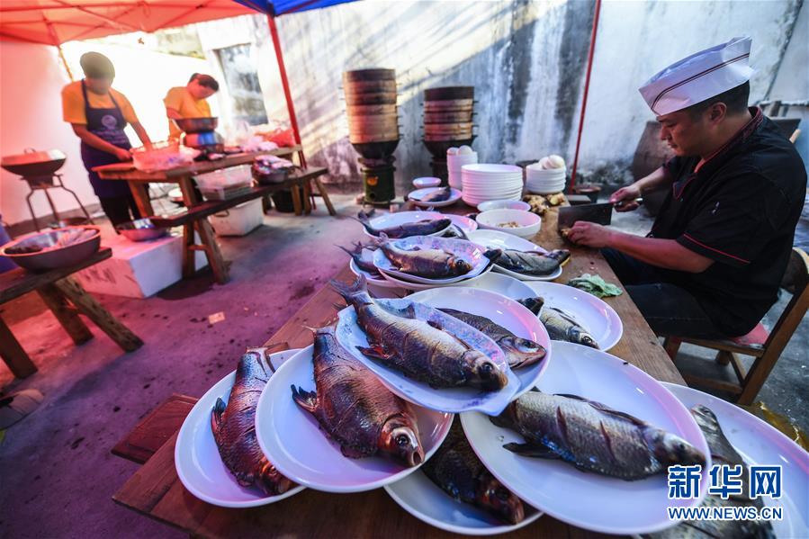 9月30日,工作人員在準(zhǔn)備江鮮宴席。當(dāng)日,浙江省杭州市富陽區(qū)場口鎮(zhèn)東梓關(guān)村開啟“江鮮第一鍋”,幾位大廚聯(lián)手在直徑1.5米的大鍋內(nèi)烹制美味江鮮,這也是當(dāng)?shù)亍敖r大會”的重頭戲。東梓關(guān)村有著1000多年歷史,古就是富春江南岸重要的商貿(mào)集散地,素有富春江“東流第一關(guān)”之稱。隨著近年來美麗鄉(xiāng)村建設(shè)的推進(jìn),東梓關(guān)村著力打造粉墻黛瓦的江南民居,同時依托富春江豐富的江鮮魚類資源,在秋季舉辦特色“江鮮大會”,通過江鮮捕撈體驗(yàn)、江鮮第一鍋、百鮮宴、農(nóng)家菜大賽等活動,吸引各地游客前來感受富春江漁民豐收的喜悅和千年古村的獨(dú)特魅力,推動鄉(xiāng)村特色旅游發(fā)展。新華社記者徐昱攝