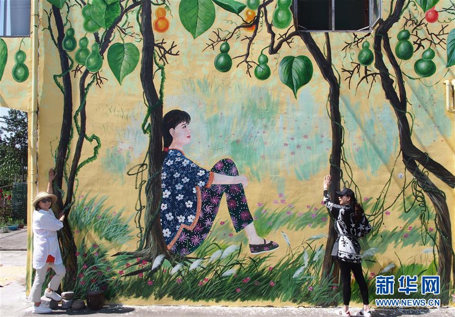 10月1日,游人在和平村的民居壁畫前留影。新華社記者任瓏攝