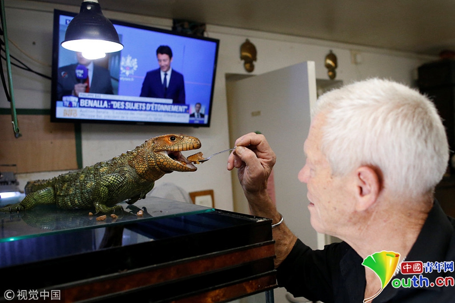 用小湯匙喂蜥蜴。盡管Philippe Gillet的這些寵物看起來(lái)對(duì)他并無(wú)傷害,但是家里有400多只爬行動(dòng)物遍布角落的感覺(jué)是什么樣,請(qǐng)自行體會(huì)。