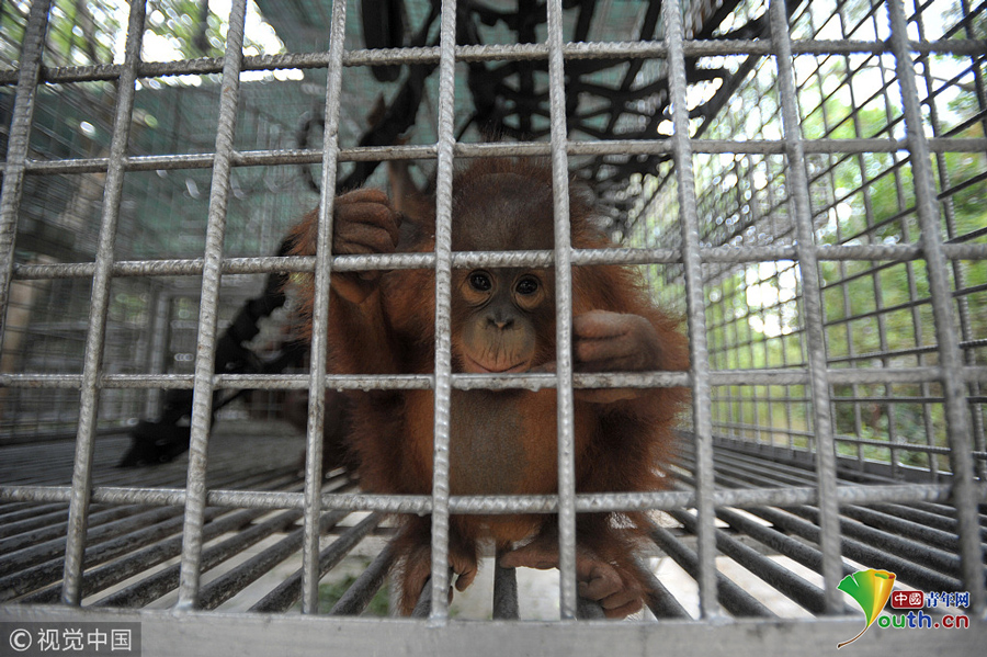 當(dāng)?shù)貢r間2018年9月18日,印尼加里曼丹克塔邦,國際動物救援(IAR)猩猩安全與保護中心里,飼養(yǎng)員用獨輪車把猩猩寶寶送到森林學(xué)校。圖片作者:Newscom