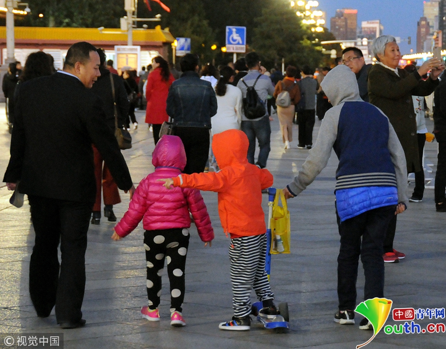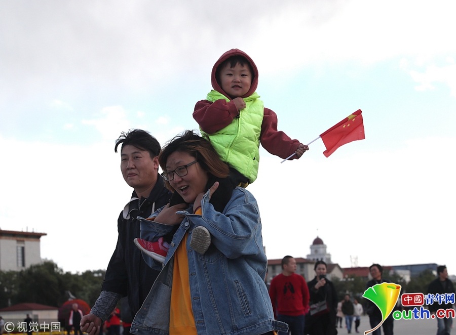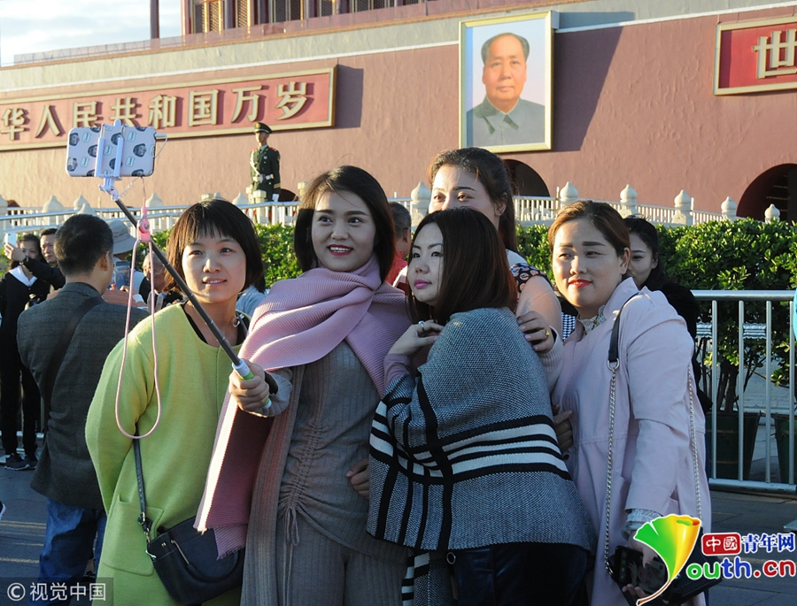 中國青年網(wǎng)北京10月10日電 2018年10月9日,北京,游客紛紛著秋冬裝游覽天安門廣場。當(dāng)天北京冷空氣來襲。圖片來源:視覺中國
