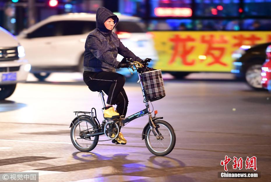 2018年10月9日,山東濟(jì)南,昨日一場秋雨過后開始降溫,今天清晨最低氣溫只有6度,馬路上不少上班族穿上羽絨服騎車趕上班路。 圖片來源:視覺中國