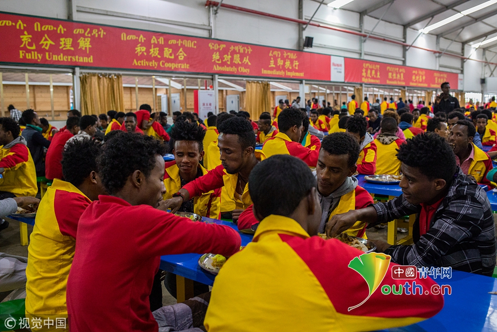 7月31日,埃塞俄比亞首都亞的斯亞貝巴的一家中國民營制鞋工廠——華堅(jiān)鞋廠,下午的工作開始前,當(dāng)?shù)毓蛦T用中文喊著“一二三四”列隊(duì)集合,合唱廠歌。