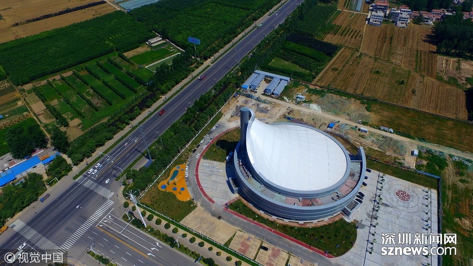 2018年6月13日,航拍河南淮陽一座即將竣工落成的體育場館建筑,市民稱酷似一個石磨盤。