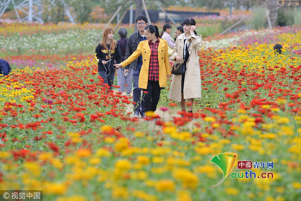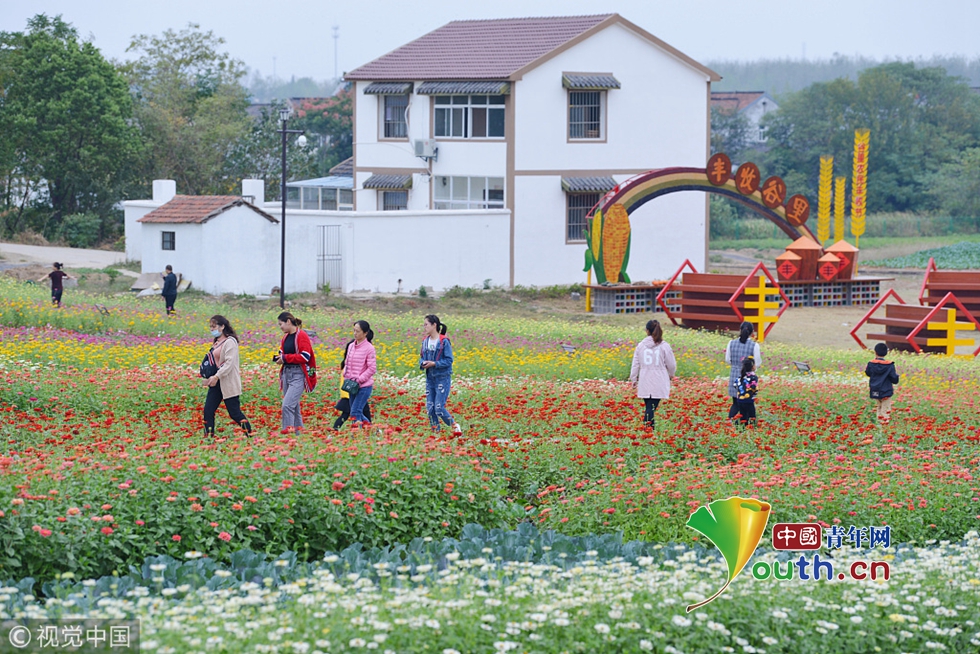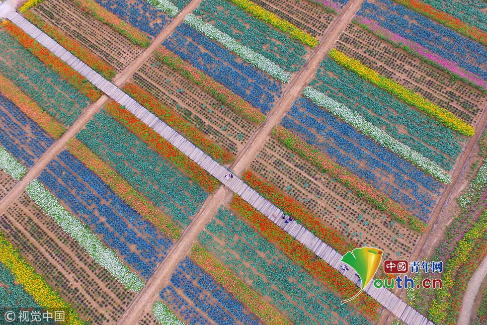 2018年10月14日,江蘇南京,江寧區(qū)谷里街道徐家院村的50萬株百日菊競相綻放,大紅、黃色、紫色……遠(yuǎn)遠(yuǎn)望去仿佛是田野間鋪上一層“五彩地毯”, 成了金秋里一道花宴盛景,吸引不少游人徜徉其中。圖片作者:方東旭/視覺中國