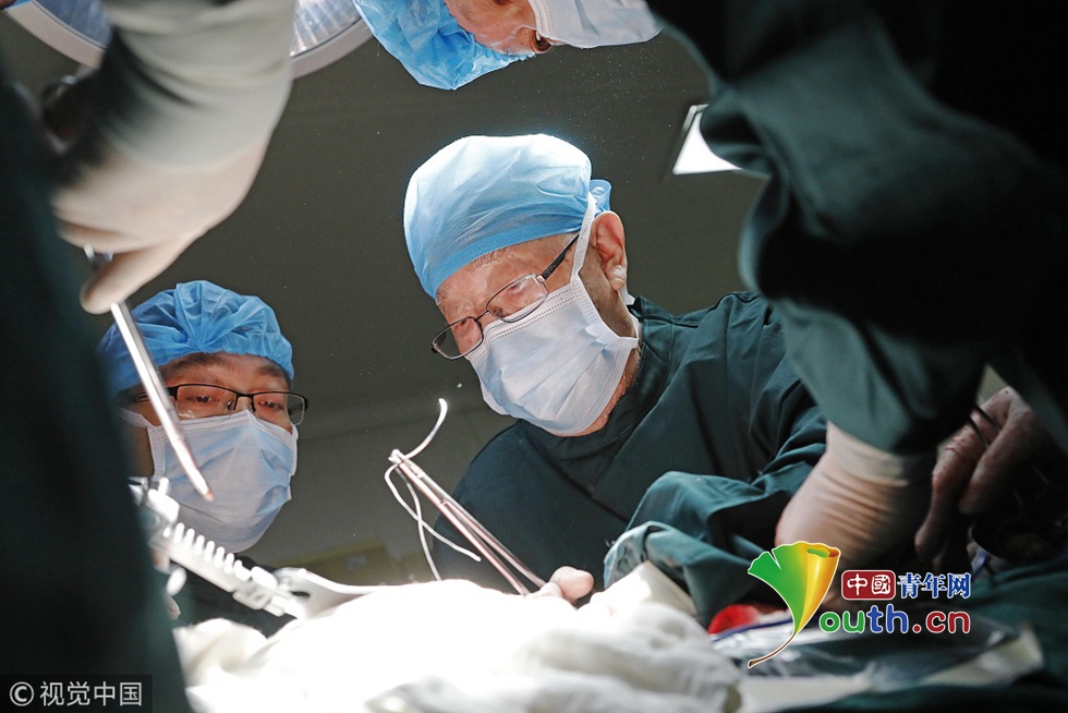 2018年4月13日,在江蘇省徐州市第一人民醫(yī)院手術(shù)室,96歲高齡的“中國肝膽外科之父”、中國科學(xué)院院士吳孟超親自為患者進行手術(shù)。當(dāng)日,吳孟超院士和中國人民解放軍海軍軍醫(yī)大學(xué)附屬東方肝膽外科醫(yī)院的醫(yī)療團隊來到江蘇徐州為患者進行手術(shù)。 殷立勤/視覺中國