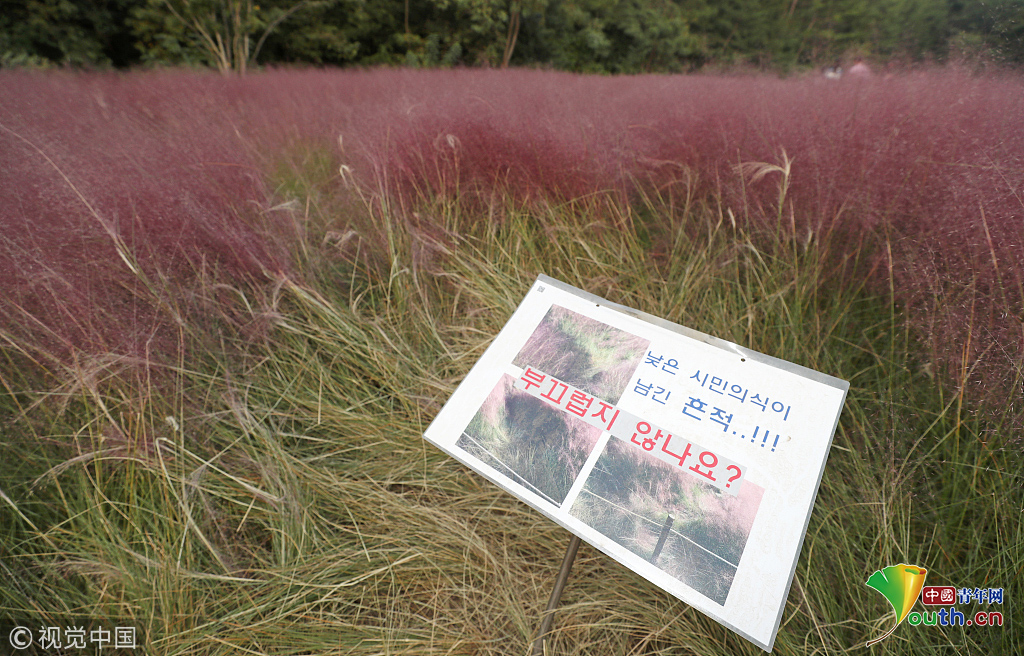 當?shù)貢r間2018年10月16日,韓國蔚山,近日,蔚山公園大片粉黛亂子草盛開,粉紅花海浪漫十足,但部分花海遭游客隨意踩踏。圖片作者:Yonhap News Agency