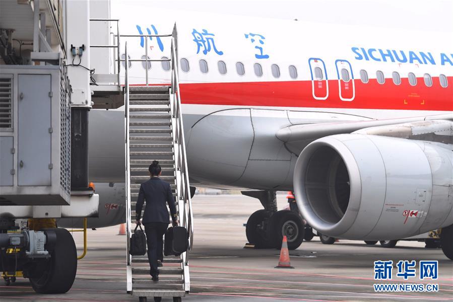 10月16日,航班抵達(dá)重慶江北國(guó)際機(jī)場(chǎng)后,湯春燕第一個(gè)走出艙門(mén),準(zhǔn)備迎接旅客下機(jī)。 新華社記者王全超攝