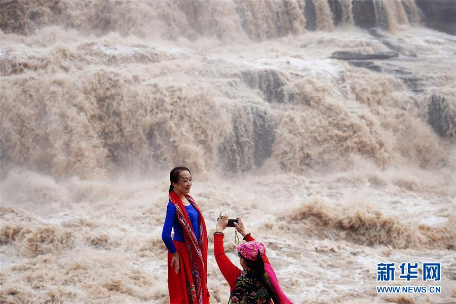 10月17日,游客在位于陜西宜川縣的黃河壺口瀑布岸邊拍照。