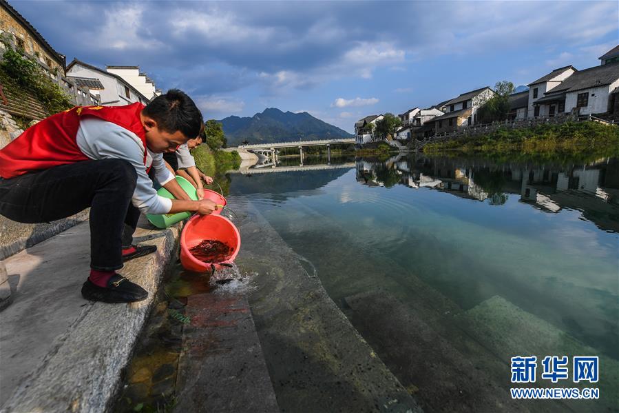 10月17日,河橋鎮(zhèn)的青年黨員們?cè)阪?zhèn)邊的昌南溪投放魚苗。