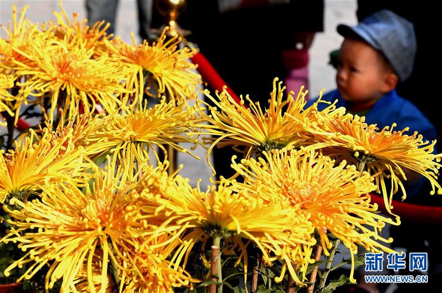 10月17日,一名小朋友在開封龍亭公園內(nèi)觀看菊花。重陽(yáng)時(shí)節(jié),各色菊花競(jìng)相綻放,把古都開封裝點(diǎn)得分外秀美,吸引眾多游客前來(lái)觀賞游玩。 新華社記者 李安 攝