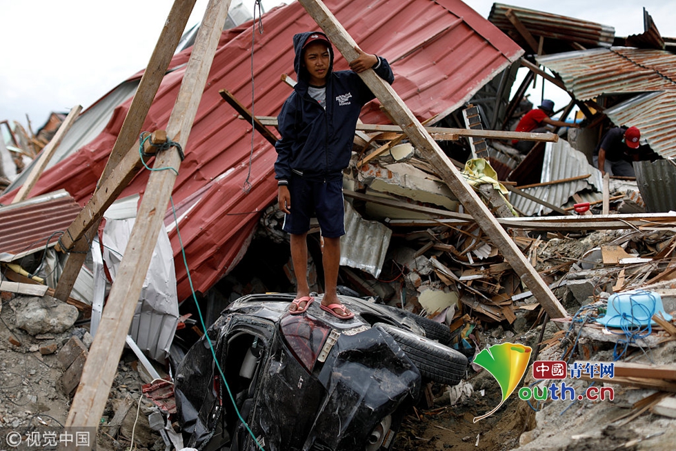 當(dāng)?shù)貢r間2018年10月11日,印尼帕盧,15歲的Ikhmal Yudanto站在他母親的汽車上,汽車在地震中被嚴(yán)重毀壞。