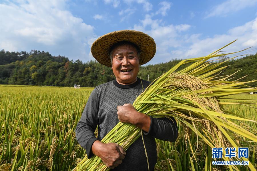 10月17日,種植戶陳元生抱著收獲的稻子。