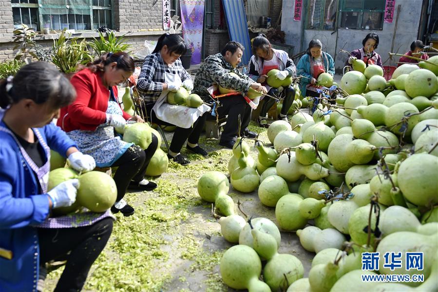 9月27日,山西省安澤縣和川鎮(zhèn)孔旺村的村民將葫蘆去皮。近日,山西省安澤縣和川鎮(zhèn)孔旺村種植的葫蘆喜獲豐收,村民們忙著將摘下的葫蘆去皮晾干??淄逵?016年成立葫蘆種植合作社,種植、采摘、加工等環(huán)節(jié)全部由貧困戶負責,為貧困戶拓寬增收渠道。新華社記者 曹陽 攝