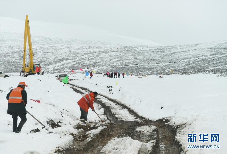 西藏道路搶通人員在西藏昌都市江達(dá)縣海拔4500米左右的高山牧場(chǎng)上搶通道路(10月14日攝)。新華社記者劉東君攝