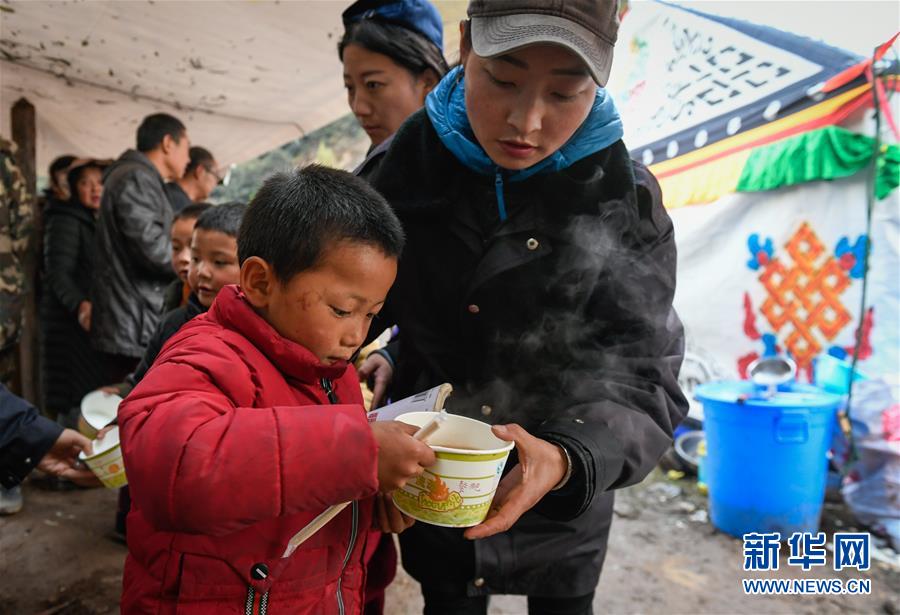 波羅鄉(xiāng)工作人員在臨時(shí)過(guò)渡安置點(diǎn)內(nèi)為波羅鄉(xiāng)第一小學(xué)學(xué)生盛晚飯(10月14日攝)。 新華社記者 劉東君 攝
