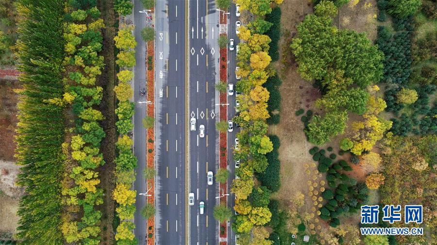 寧夏銀川市鳳凰公園秋景(10月20日無(wú)人機(jī)拍攝)。