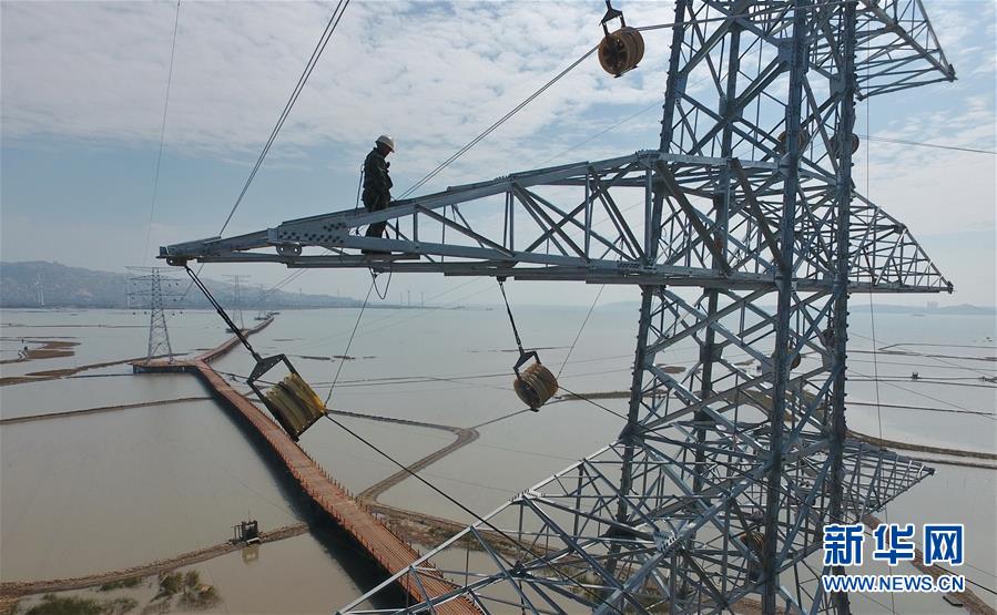 10月25日,埭頭風(fēng)電送出工程施工人員在跨平海灣段的鐵塔上作業(yè)(無人機(jī)拍攝)。 新華社記者林善傳攝