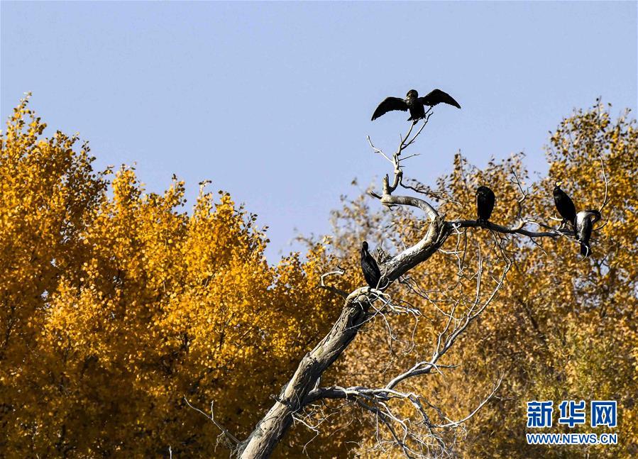在位于新疆巴音郭楞蒙古自治州輪臺縣的一處胡楊林里,鳥兒站在胡楊枝頭上(10月25日攝)。