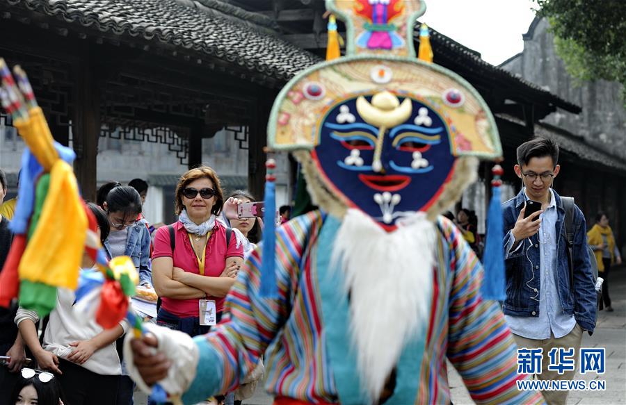 頭戴“藍”面具、身著五彩裝……附耳在一鼓一鈸中,且看這18名雪域農(nóng)牧民,在這江南水鄉(xiāng)的柔情中吟唱而舞。10月23日至28日,浙江烏鎮(zhèn)西柵景區(qū)的安渡坊碼頭廣場上,珠峰藏戲《頓月頓珠》吸引眾多游客駐足。參與演出的迥巴藏戲隊來自西藏日喀則市昂仁縣,人們在領(lǐng)略到藏戲風采的同時,也感受到了雪域農(nóng)牧民的純樸熱情。 藏戲是戴著面具、輔以唱舞敘事的藏族戲劇。內(nèi)容取材自民間故事、歷史傳說等,距今已有600多年歷史,被譽為“西藏文化的活化石”。2006年被列入國家級非物質(zhì)文化遺產(chǎn),2009年被聯(lián)合國教科文組織認定為世界級非物質(zhì)文化遺產(chǎn)。