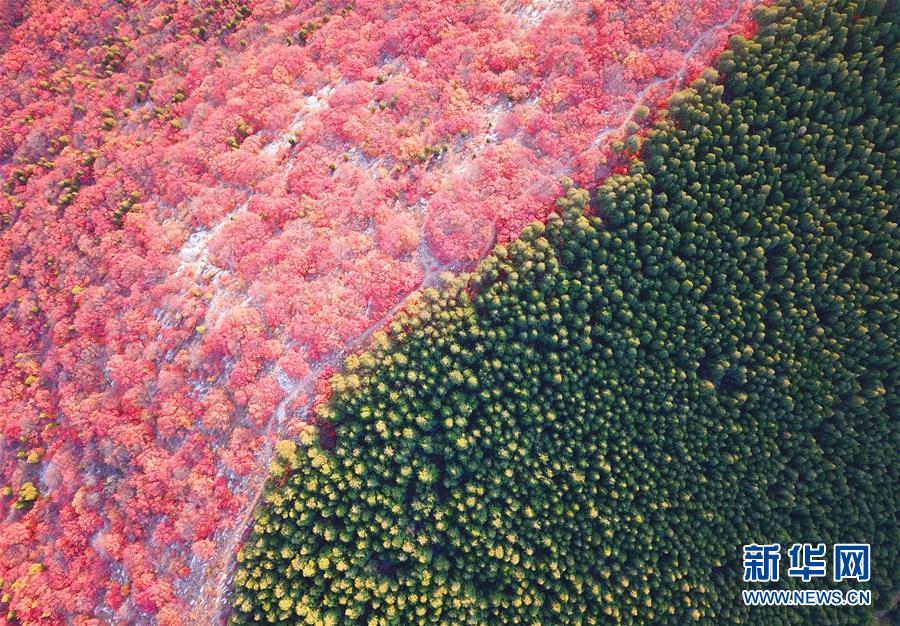 這是山東濟南楔子山色彩分明的樹林(10月31日無人機拍攝)。 新華社記者 朱崢 攝