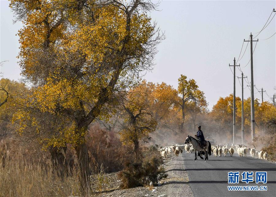 在新疆巴音郭楞蒙古自治州尉犁縣喀爾曲尕鄉(xiāng)的胡楊林里,牧羊人馬木提·買(mǎi)買(mǎi)提在放羊(10月25日攝)。 新華社記者 趙戈 攝