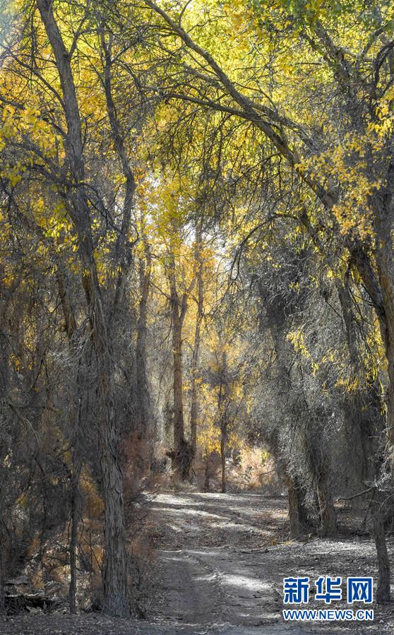 新疆尉犁縣胡楊林深處的一條小路(10月25日攝)。 10月中下旬,靜靜的塔里木河中下游一片金黃。胡楊深處,條條小路蜿蜒綿長(zhǎng)通向遠(yuǎn)方,引人入勝。 塔里木河是中國(guó)最長(zhǎng)的內(nèi)陸河,這一區(qū)域原始胡楊林分布較為集中。隨著塔里木河連續(xù)19次向下游生態(tài)輸水,為胡楊林“解渴”,塔河兩岸生態(tài)得到明顯改善,沙地面積逐年減少。 新華社記者趙戈攝