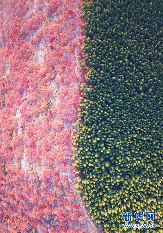 這是山東濟(jì)南楔子山色彩分明的樹(shù)林(10月31日無(wú)人機(jī)拍攝)。