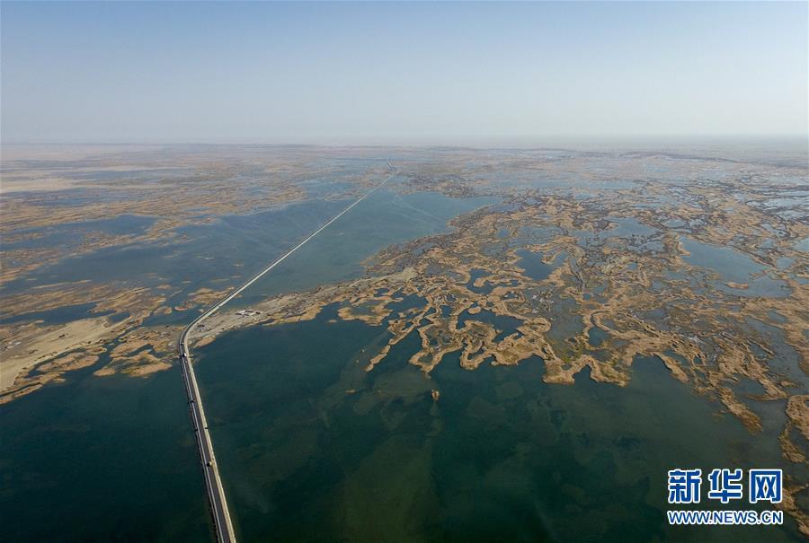 218國道在塔里木河尾閭——臺(tái)特瑪湖中間延伸(2017年10月22日無人機(jī)拍攝)。 新華社記者 趙戈 攝