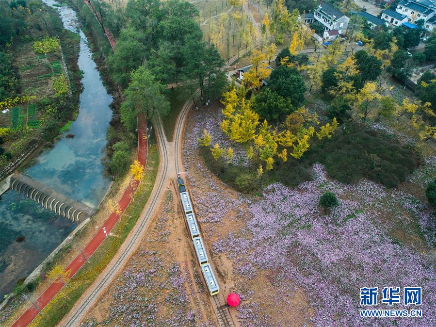 一列觀光小火車帶著游客穿行在銀杏林和花海之間(11月16日無(wú)人機(jī)拍攝)。近日,在浙江省長(zhǎng)興縣小浦鎮(zhèn),“十里銀杏長(zhǎng)廊”和近千畝花海經(jīng)過(guò)近一年的升級(jí)改造后,以嶄新的面貌與游客見(jiàn)面?;ê!⒂^光小火車、古村民宿、銀杏長(zhǎng)廊等旅游項(xiàng)目全面提升了小浦鎮(zhèn)鄉(xiāng)村旅游的品質(zhì)。新華社記者 徐昱 攝
