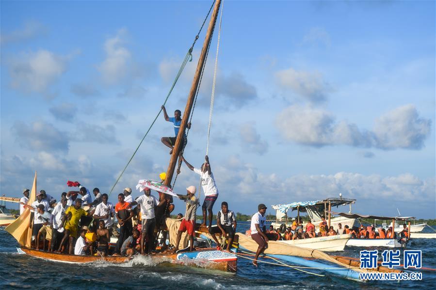 11月24日,在肯尼亞東部印度洋上,贏得獨桅三角帆船比賽的拉穆居民慶祝勝利。這種帆船曾是東非海洋貿(mào)易的主要交通工具,拉穆本地居民至今還以能駕馭三角帆船為榮。