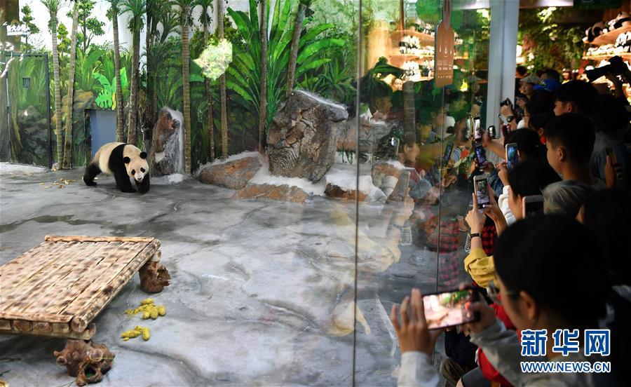 11月25日,游客在海南熱帶野生動植物園熊貓館觀看大熊貓“舜舜”。