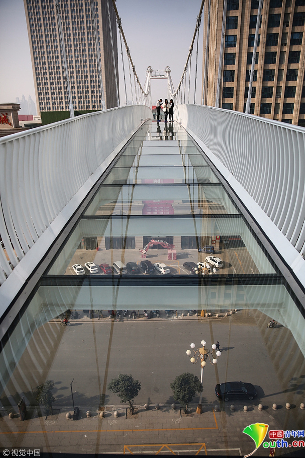 玻璃吊橋被三座高層寫(xiě)字樓所環(huán)繞,緊鄰石家莊火車站和南二環(huán)高架橋,車流、人流密集。