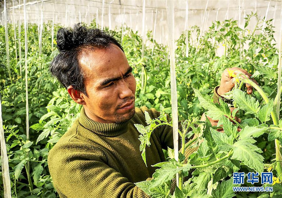 拜什托格拉克鄉(xiāng)和融新村村民艾力·吾吉艾合麥提在大棚里查看番茄的生長情況(11月29日攝)。 新華社記者 白志強(qiáng) 攝