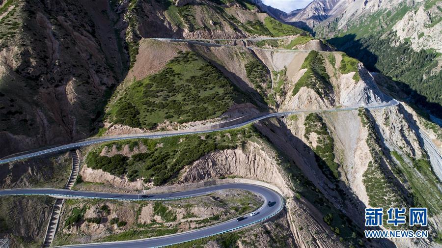 連續(xù)轉(zhuǎn)彎的獨(dú)庫(kù)公路盤山道(2017年7月15日無人機(jī)拍攝)。 新華社記者 江文耀 攝