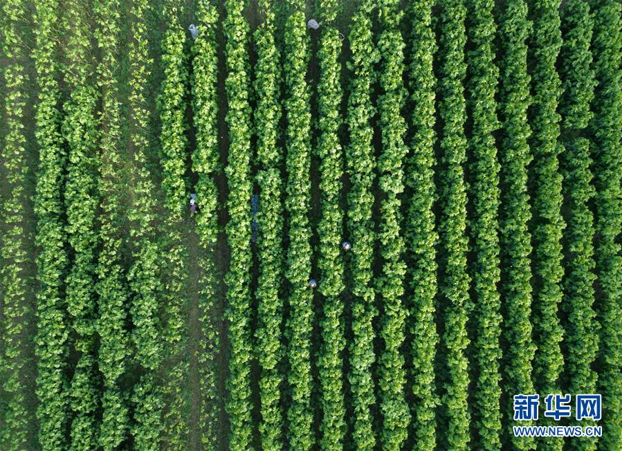 養(yǎng)蠶工人在下姜村采摘桑葉(5月9日無(wú)人機(jī)拍攝)。
