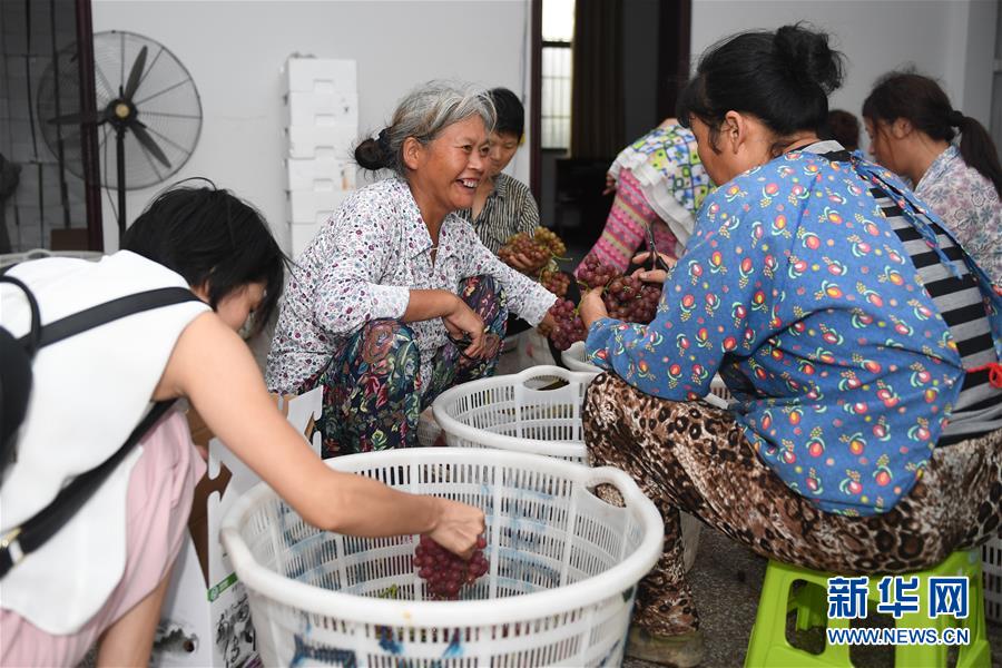 下姜村村民將剛采摘的葡萄挑揀裝箱(2017年8月9日攝)。下姜村用流轉(zhuǎn)的土地建成葡萄園、草莓園、茶葉園、中藥材園等產(chǎn)業(yè)園區(qū),村民收入實(shí)現(xiàn)了“節(jié)節(jié)高”。