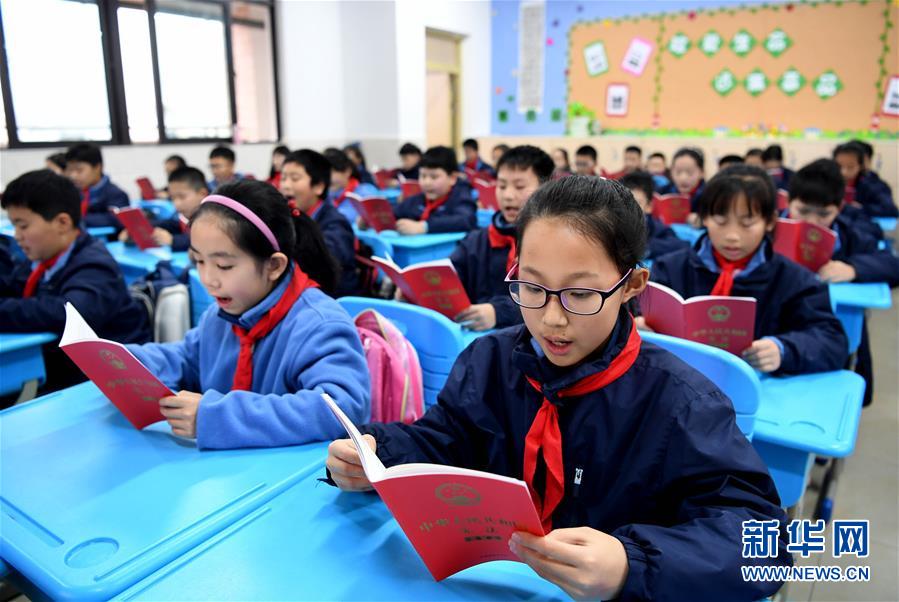 12月3日,合肥市朝霞小學的學生們在誦讀憲法。國家憲法日到來之際,各地學校紛紛舉辦主題宣講活動,對學生開展法治教育,幫助孩子們了解憲法知識。新華社記者 劉軍喜 攝
