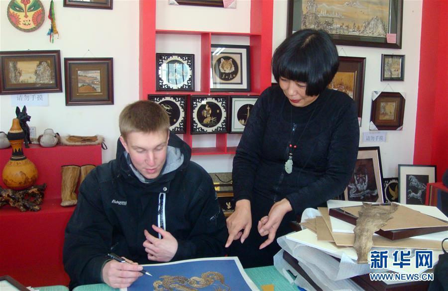張琳在位于哈爾濱的工作室指導前來參觀學習的外國學生制作魚皮畫(2011年3月20日攝)。國家級非物質(zhì)文化遺產(chǎn)赫哲族魚皮制作技藝是我國赫哲族傳統(tǒng)手工藝術。作為這項技藝的黑龍江省級傳承人,十余年來,張琳一直從事魚皮畫的研究和創(chuàng)作,并通過做推廣、開講座、辦活動,讓更多年輕人了解并喜歡上這一傳統(tǒng)手工藝,將這項瀕臨失傳的藝術更好地傳承下去。新華社發(fā)
