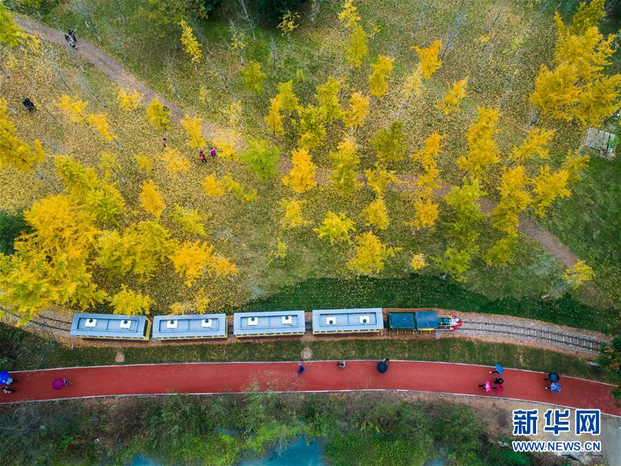 一列觀光小火車帶著游客穿行在銀杏林里(11月16日無人機拍攝)。近日,在浙江省長興縣小浦鎮(zhèn),“十里銀杏長廊”和近千畝花海經(jīng)過近一年的升級改造后,以嶄新的面貌與游客見面?;ê!⒂^光小火車、古村民宿、銀杏長廊等旅游項目全面提升了小浦鎮(zhèn)鄉(xiāng)村旅游的品質(zhì)。新華社記者 徐昱 攝
