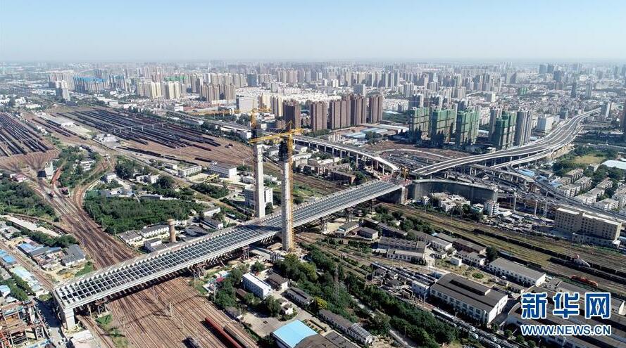9月7日無(wú)人機(jī)拍攝的鄭北大橋鋼梁頂推施工現(xiàn)場(chǎng)。當(dāng)日,跨越鄭州北站的鄭北大橋鋼梁頂推成功。鄭北大橋是東西走向的鄭州市農(nóng)業(yè)路快速通道工程的一部分,需跨越鄭州北站。由于列車不能中斷運(yùn)行,鄭北大橋不能采用常見的搭腳手架方式施工,而是采用頂推法,即在大橋一端把橋身拼接好,然后一段一段朝著鐵路編組站上方送過(guò)去,最終完成橋梁架設(shè)。新華社記者朱祥攝
